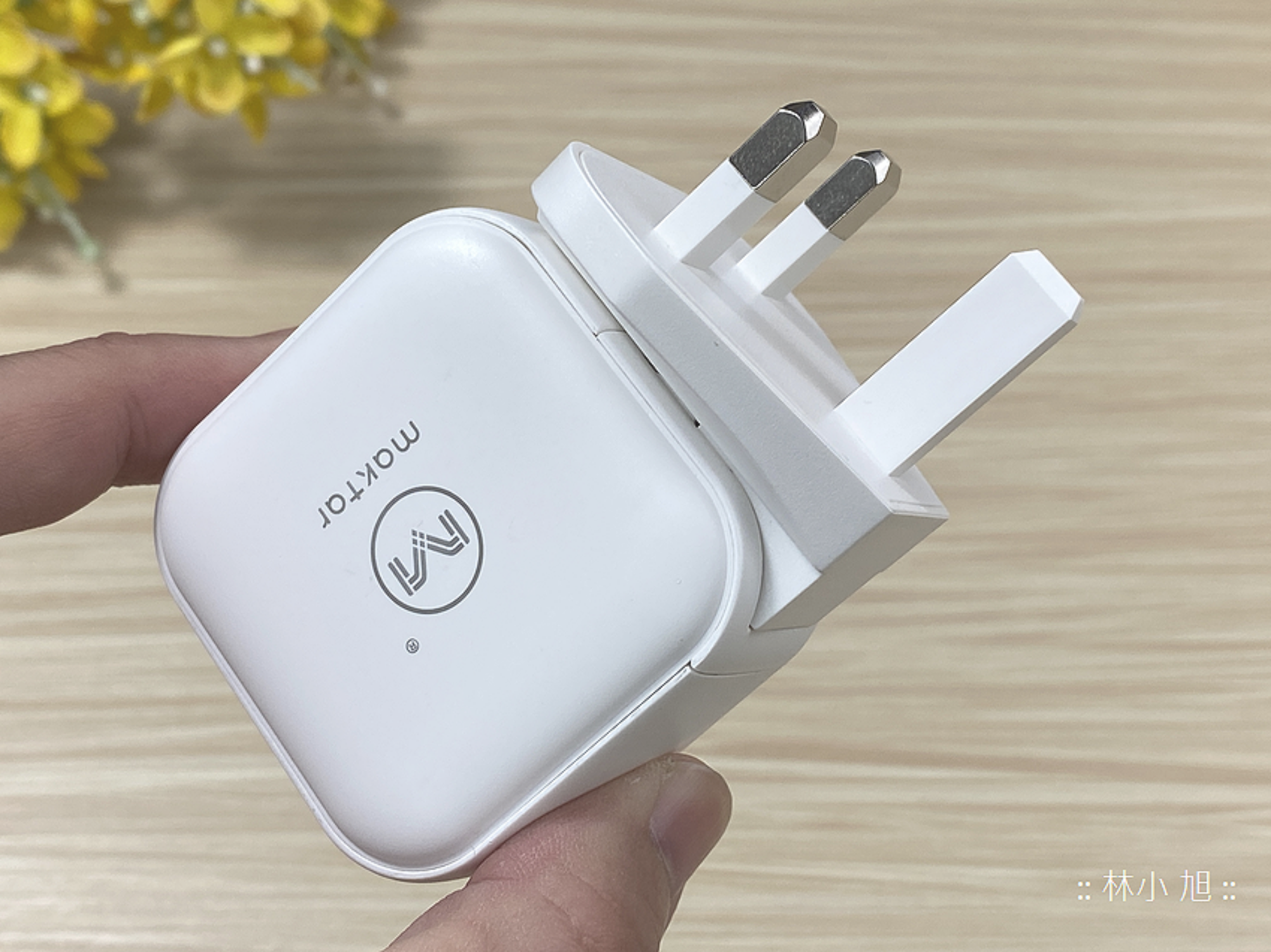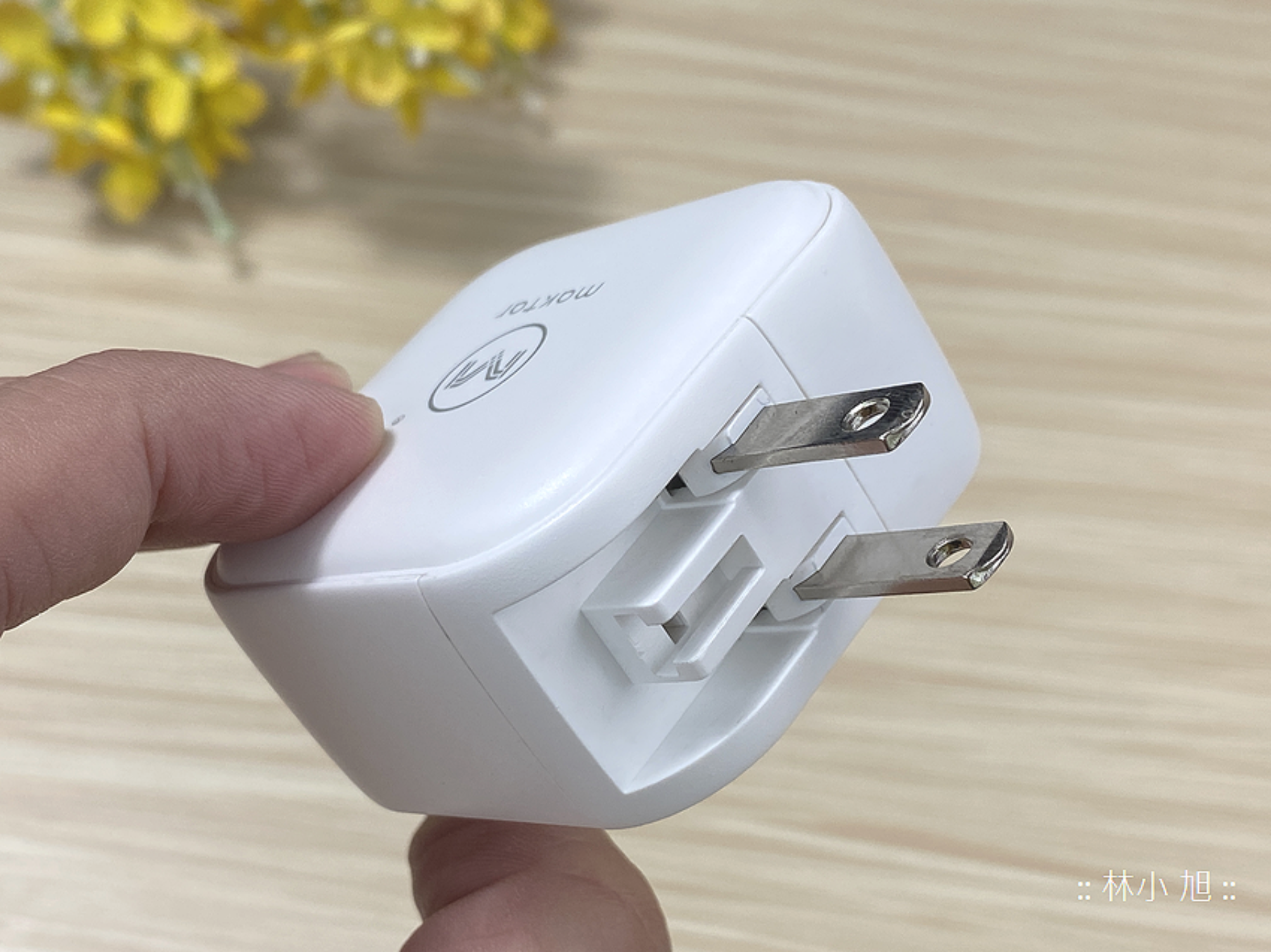 小旭實測將「Maktar 66WGaN 口袋快充™」插在插座上時,隔壁插座還能插上其他電源接頭,因使使用時可以保有更多插座使用彈性,完全沒有以前充電器體積太大容易掉下來或太寬而使隔壁插座無法使用的困擾!