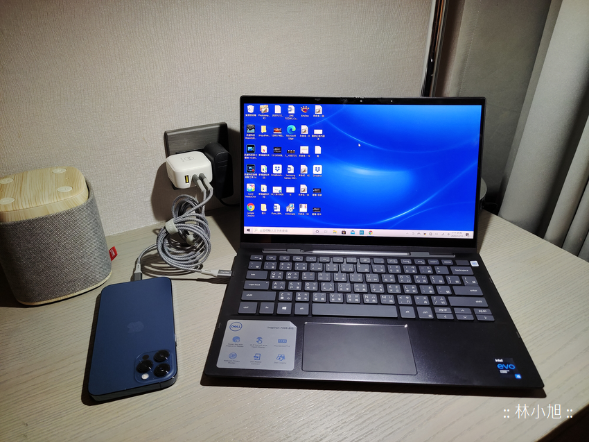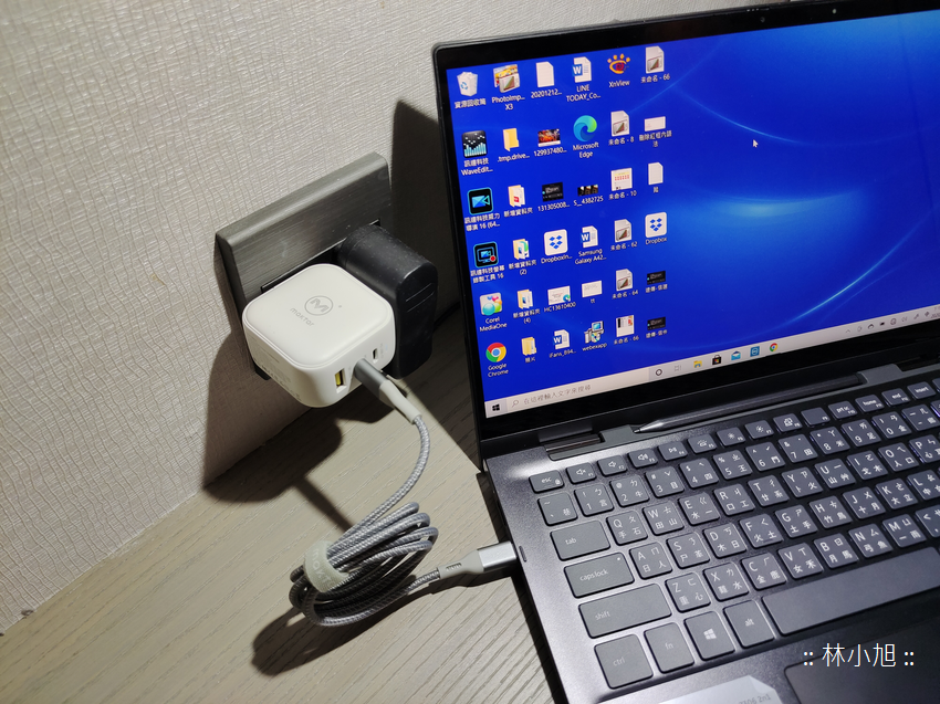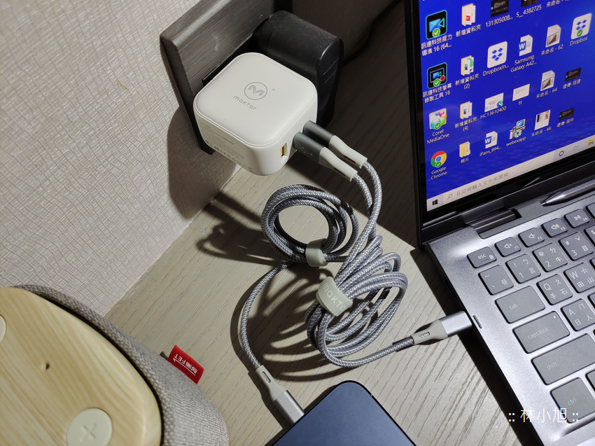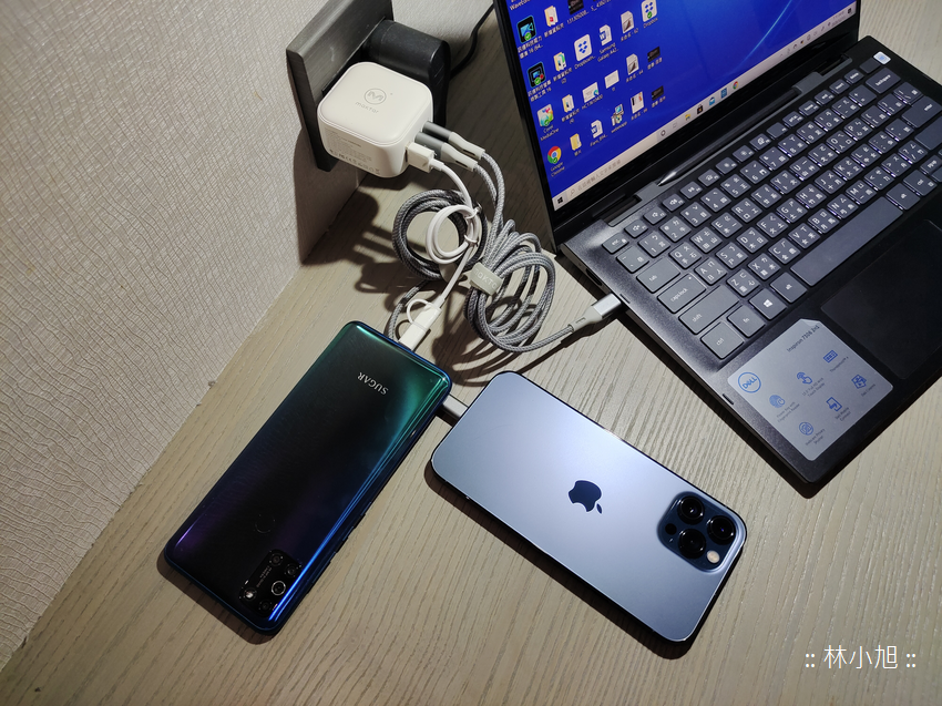 小旭實測一台低電壓處理器筆電 + 一台 iPhone 12 Pro Max + 一台 Android 智慧型手機,三個裝置一起充電也都沒有問題,筆電部分仍可提供 30W 充電效能,手機則可在快速充電的狀態,讓外出工作不怕電力不足!!