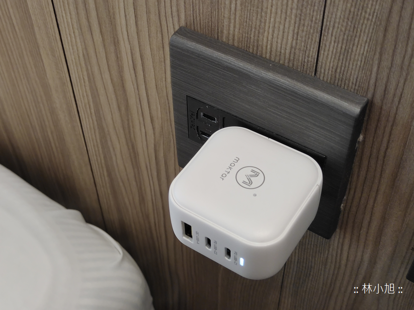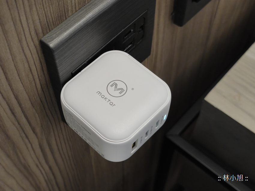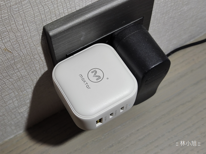 對了!不知道你注意到了嗎?由於「Maktar 66WGaN 口袋快充™」體積很小,所以插在牆壁插座上時不僅相當穩固,甚至不影響到隔壁插座空間,所以旁邊插座孔還能插入其他產品來使用 (當然也要看另外一個設備的充電器會不會太大),這也是一個很方便的地方!