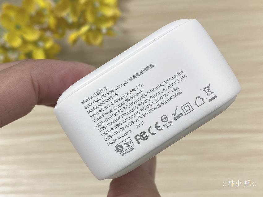 輸出規格部分,兩個 USB Type-C 都可以輸出 5V/9V/12V/15V 各自最大 3A 規格,如果是 20V 輸出則是可達 3.25A;至於 USB Type-A 輸出則是 5V/9V/12V 各自最大 3A,輸出 20V 時最高 1.8A,假如三個插孔都同時插上裝置充電,那麼會是 30W+18W+18W,最大的總輸出為 66W,充電器標示也可以看到各種輸出標示以及多國安規認證,在安全性方面提供完善的保障!