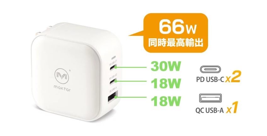 這篇小旭要開箱的「Maktar 66WGaN 口袋快充™」,它不僅能對智慧型手機與平板電腦、智慧手錶、遊戲機、行動電源進行充電,最大輸出高達 66W 的強悍規格更能對「低電壓處理器筆記型電腦」進行充電,小小一顆就有 PD 與 QC 兩種充電規格,還同時帶來兩個 USB Type-C 以及一個標準 USB Type-A,不管你的手機、平板是什麼規格,通通能透過這顆小巧充電器幫你快速充電!^^