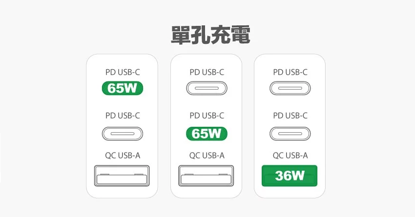 單孔 USB Type-C 最大可輸出 65W Power Delivery (PD) 充電規格,這個模式可以對「低電壓處理器筆電」或是支援 PD 規格的智慧型手機來做快速充電,而 USB Type-A 則是可輸出最高 36W 的 Quick Charge 3.0 (QC 3.0) 充電規格,大部分 Android 智慧型手機也都可以在此模式下使用到最高 36W 的快速充電模式!