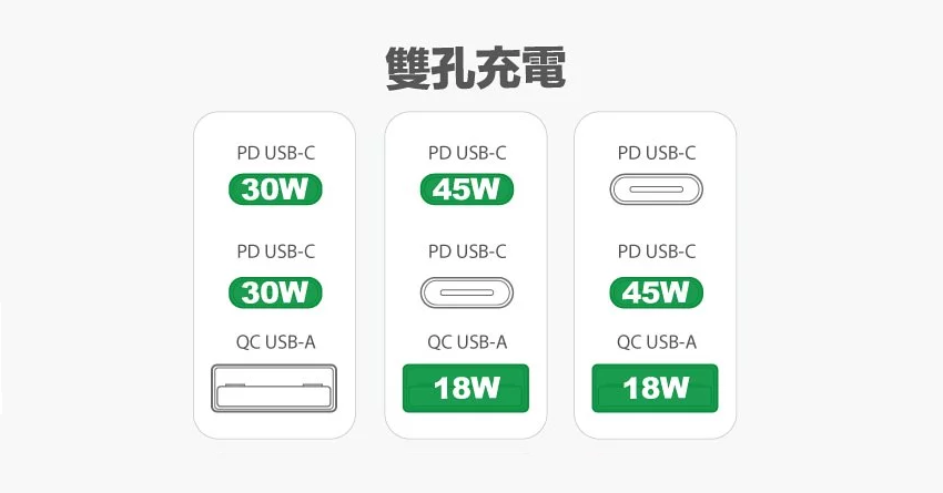 如果是雙孔插上裝置進行充電,則可分別對應成上圖輸出規格,最大輸出可達到 PD 充電規格 30W~45W,而 QC 規格則可達到 18W,要完全為智慧型手機、平板電腦、智慧型手錶、行動電源等裝置來做快速充電也不是問題!