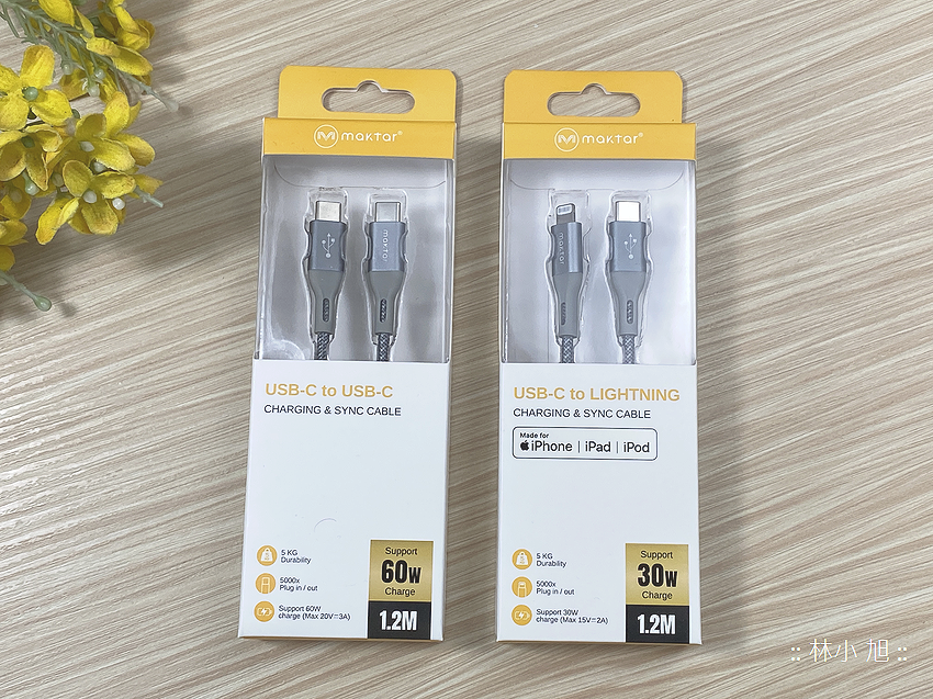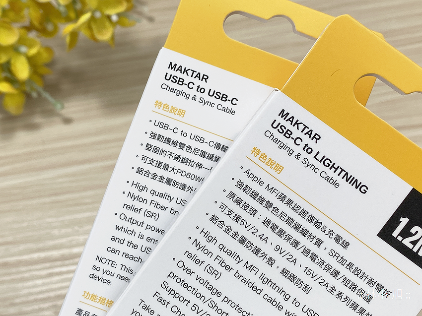 Maktar 旗下也有推出最高 60W 的 USB Type-C 快充傳輸線以及最高 30W 的 USB Type-C to Lightning 快充傳輸線來提供使用者選購,兩種快充傳輸線都使用尼龍纖維材質打造,不僅線身可在使用時更強韌耐用,也有不容易打結、脫線、糾結等優點,線頭部分更以 SR 加強穩固,可大幅降低線材與線頭之間的斷裂或剝落狀況發生!