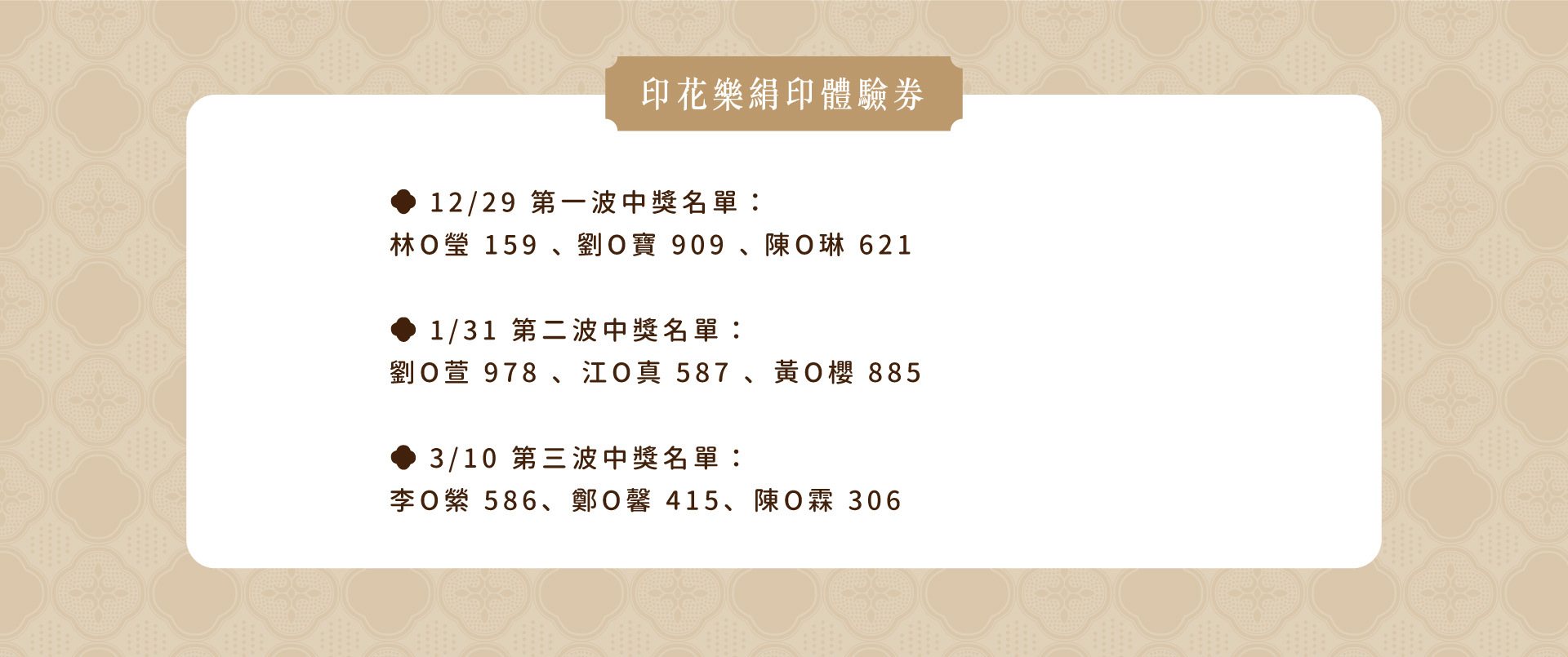 得獎公告:預計於12/29、1/31、3/10於官網公告各梯次中獎名單,於公佈後七個工作天內由專人統一聯繫後續贈獎事宜,需於期限內回傳提供所需資料否則將喪失得獎資格。