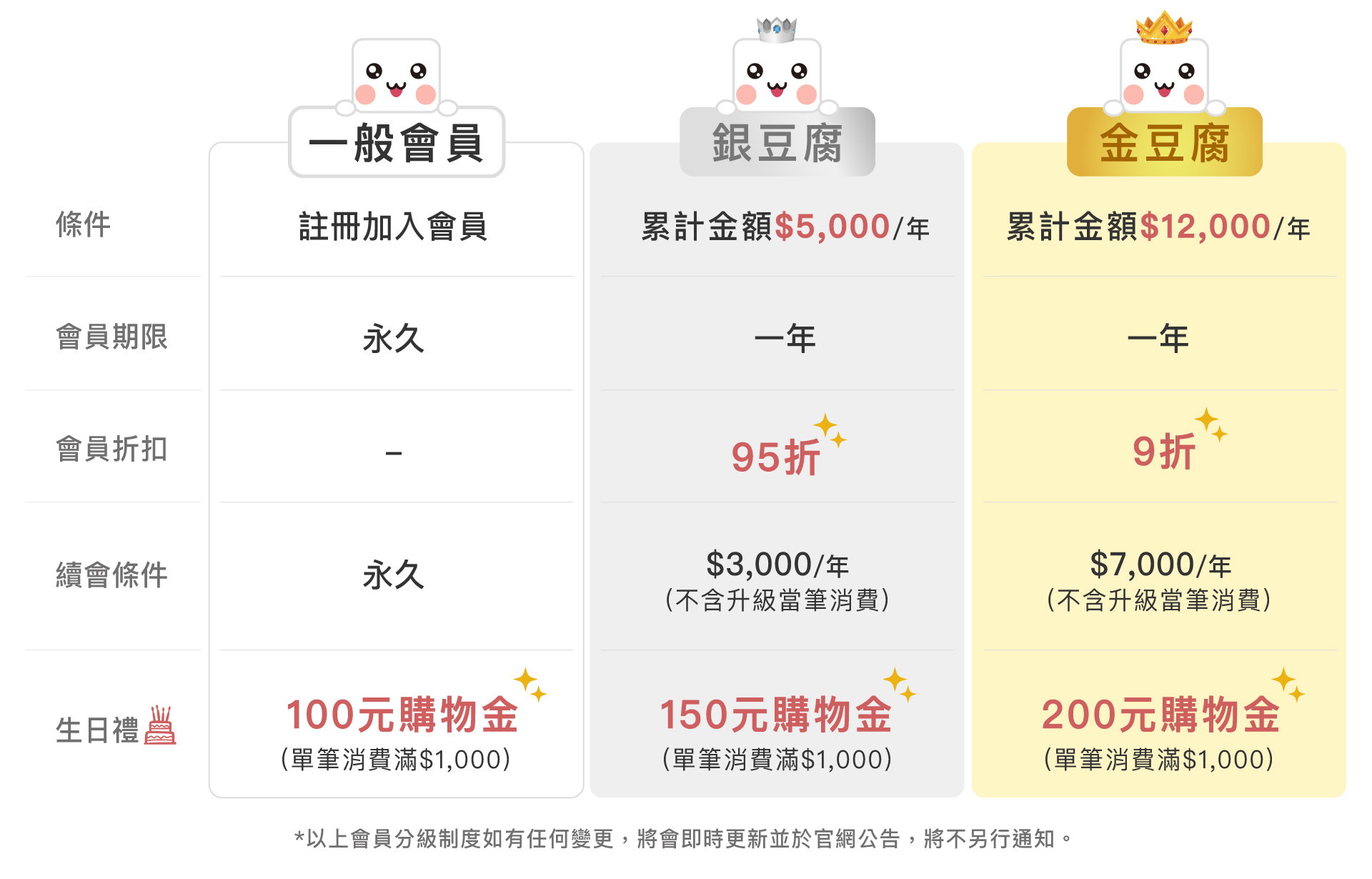 B. 銀豆腐 - 年度累積消費滿5,000元,訂單完成後即可升級為銀豆腐,一年期間消費累積滿 3,000元可自動延續銀豆腐資格一年。