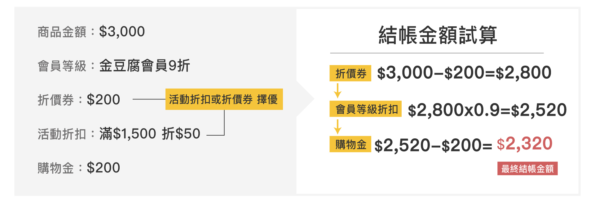 ⭐️優惠計算順序:折價券或滿額折(擇優) →會員等級折扣 →購物金