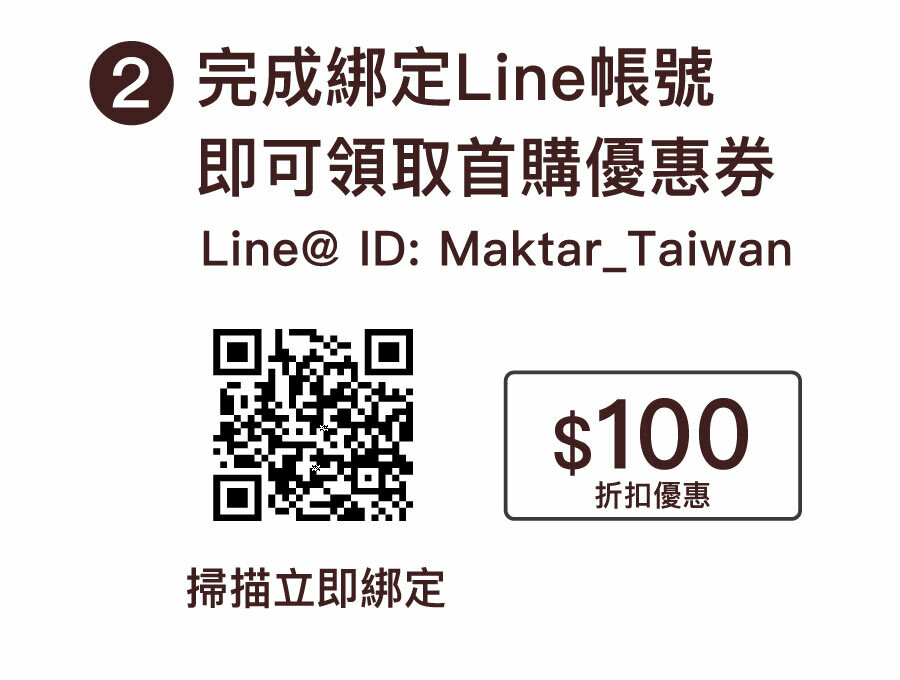 註冊Maktar會員並綁定LINE會員即贈100元折價券,單筆消費滿千即享有免運優惠!新會員折價券有效期限制,過期將自動失效。(限首次綁定,每位會員限用一次。活動效期依當期活動有所不同,敬請留意)