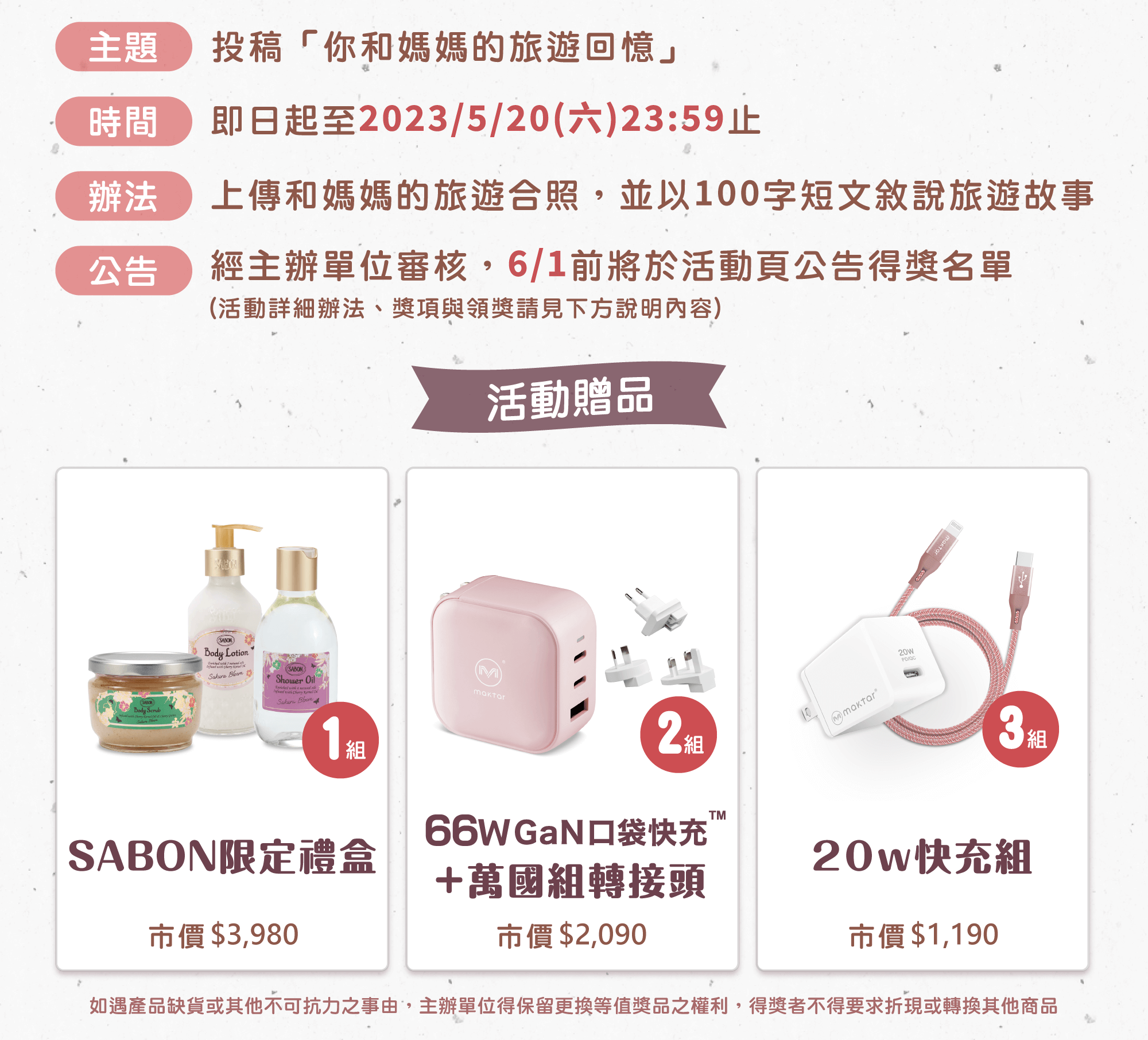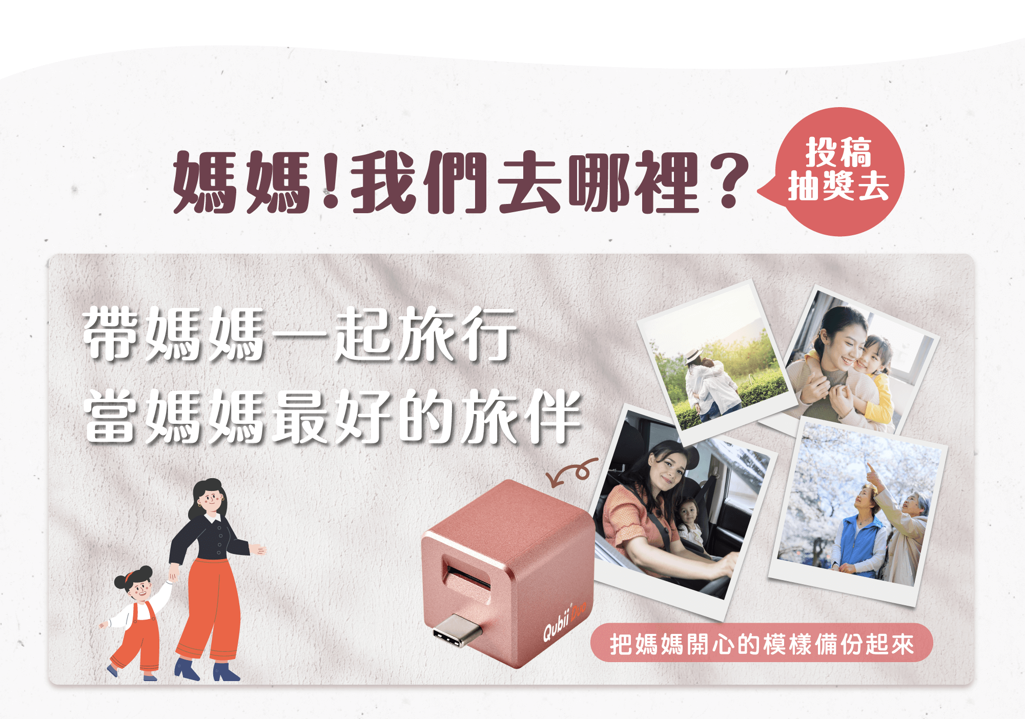於指定活動頁投稿「你和媽媽的旅遊回憶」,上傳主題照片與100字短文敘述旅遊故事,完成表單送出後即可獲得抽獎資格!