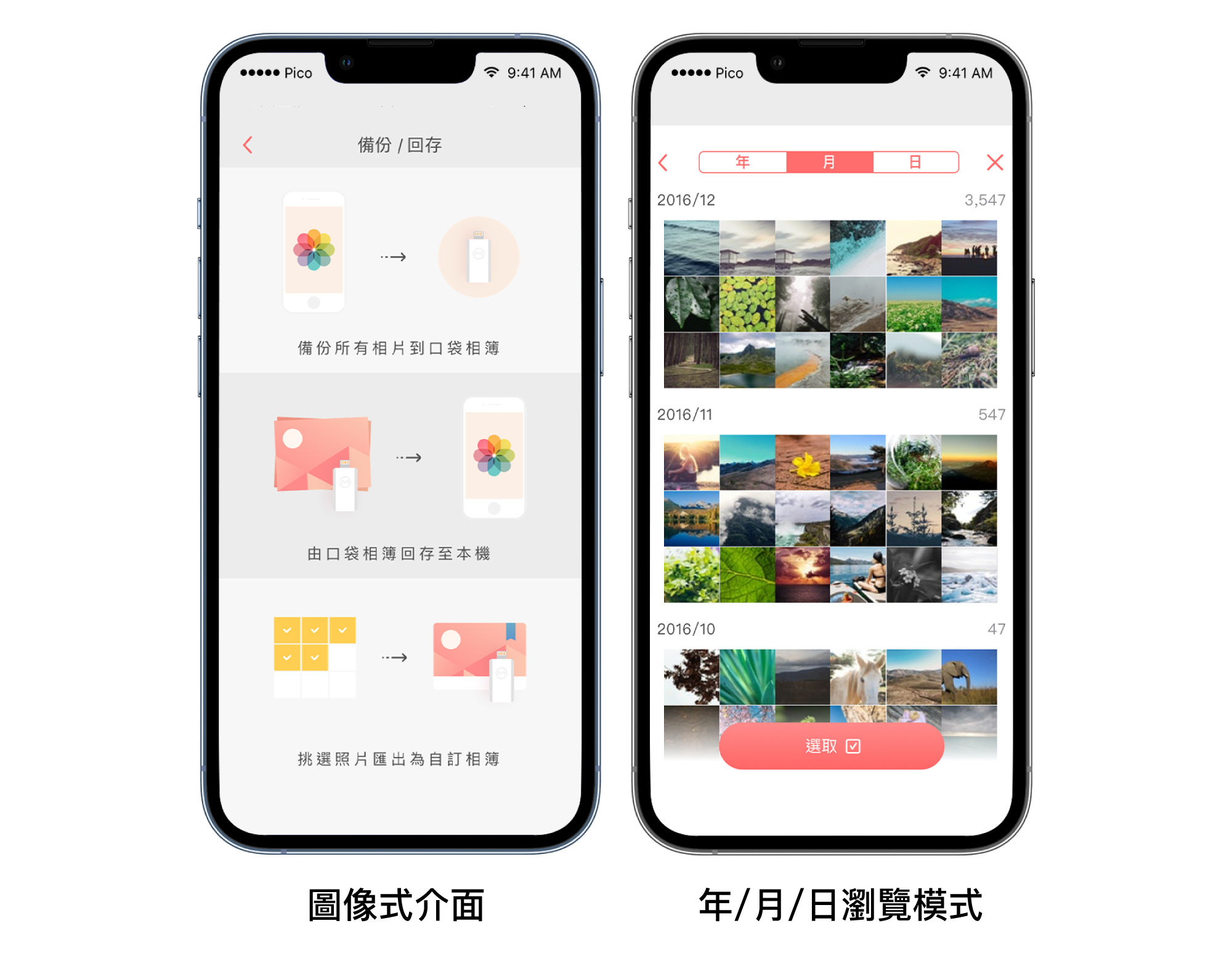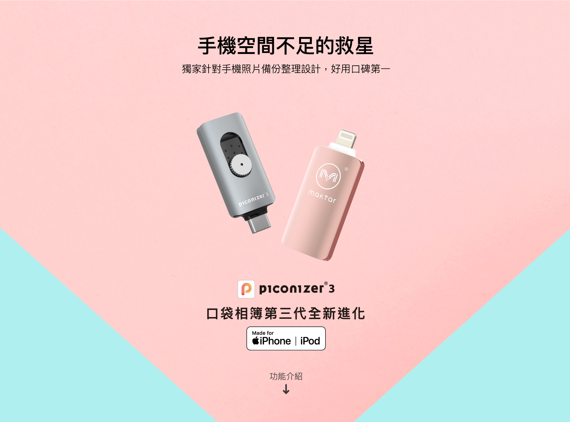 口袋相簿在備份原始照片的同時,會自動產生一份只有1/5大的迷你相簿在piconizer App中,讓你沒插上口袋相簿也可以隨時欣賞曾經備份過的照片,幫您省下更多拍照空間!