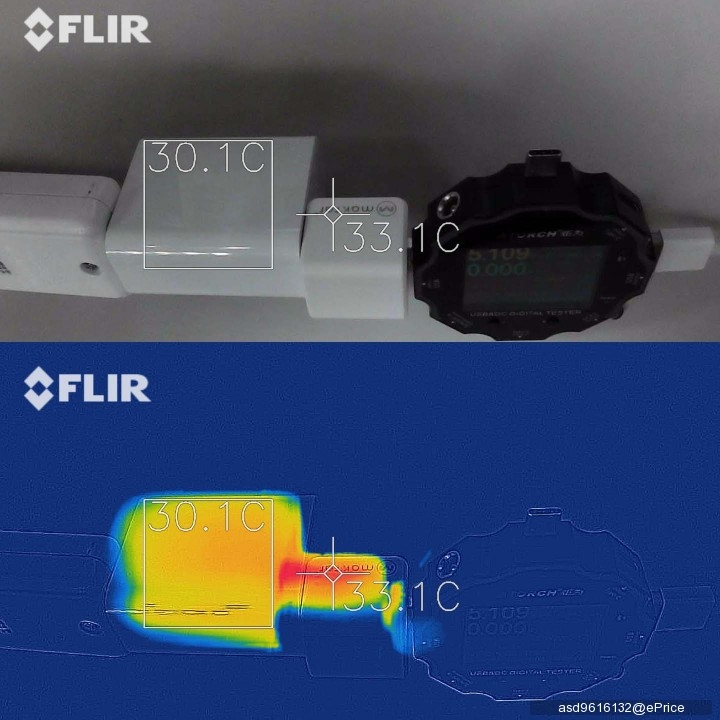 至於充電頭自己稍微用FLIR熱顯像儀看了一下溫度約在34左右,控制得非常好