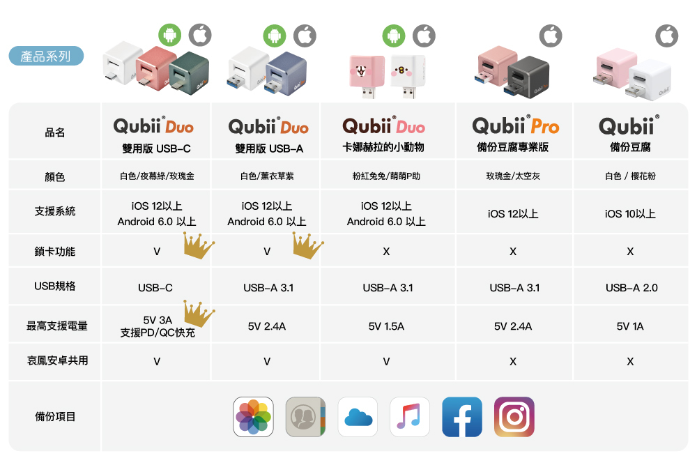 Qubii備份豆腐有不同的系列,支援不同手機作業系統,也有不同的功能(鎖卡、快充等等)