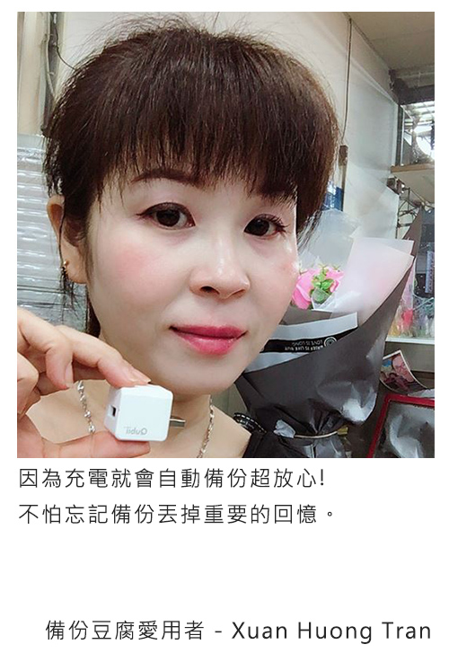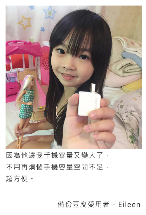 平日要上班,下班要顧小孩,真的很忙!手機容量也因為小孩出生後,一直處於爆炸邊緣,還好有備份豆腐幫了我這個忙,充電就自動備份,真的方便很多。