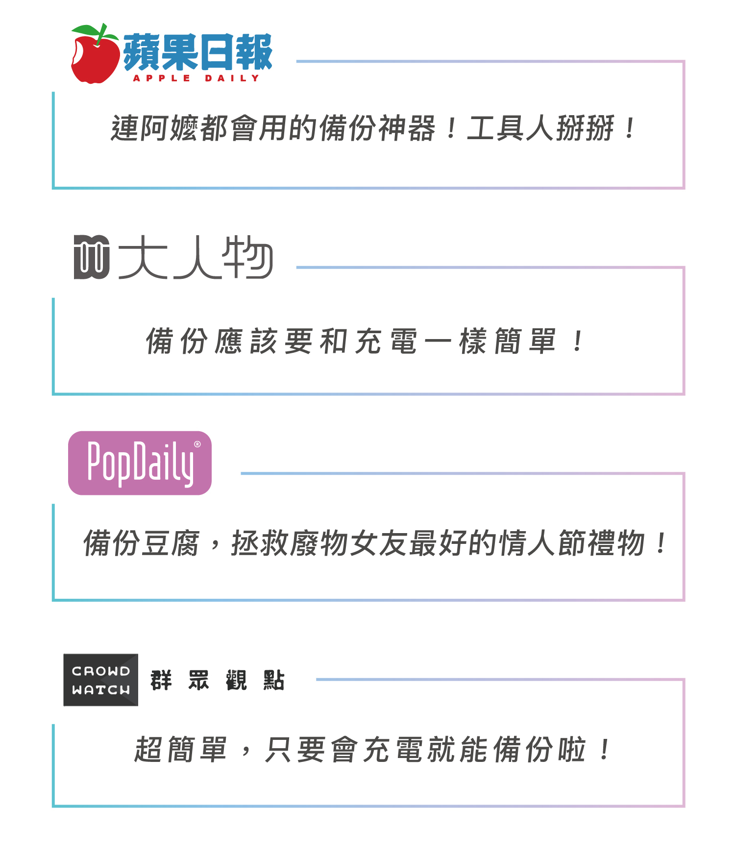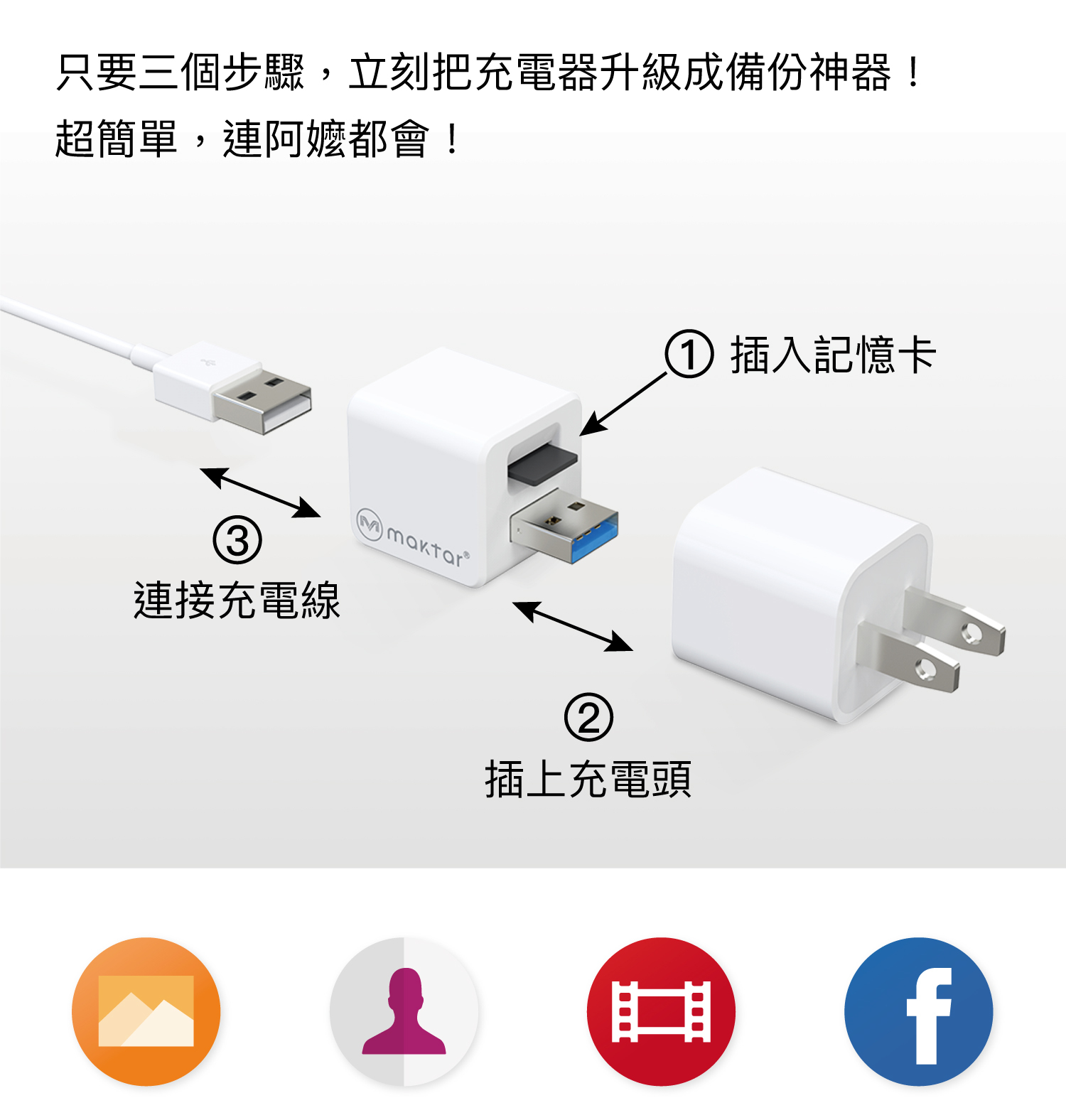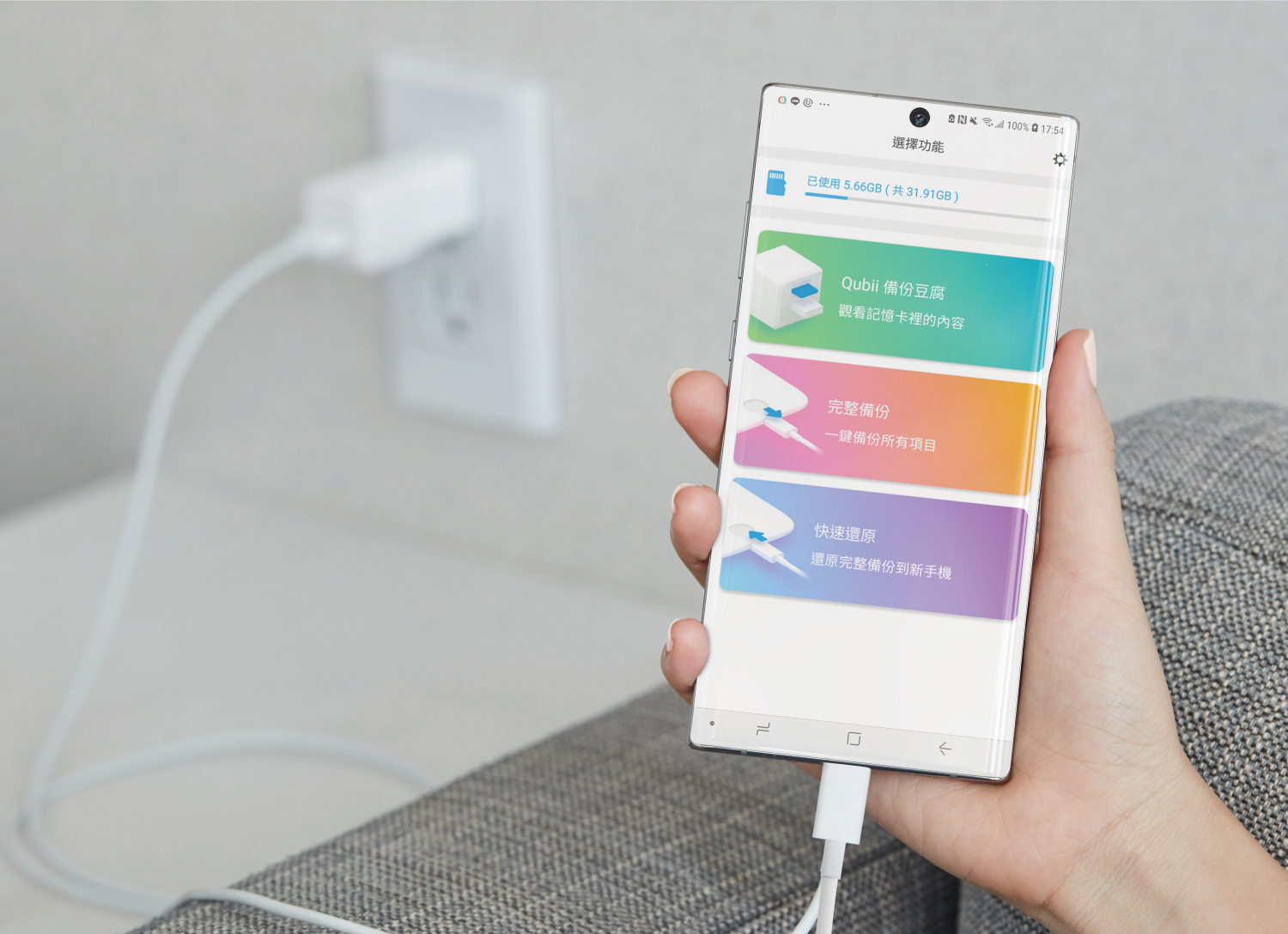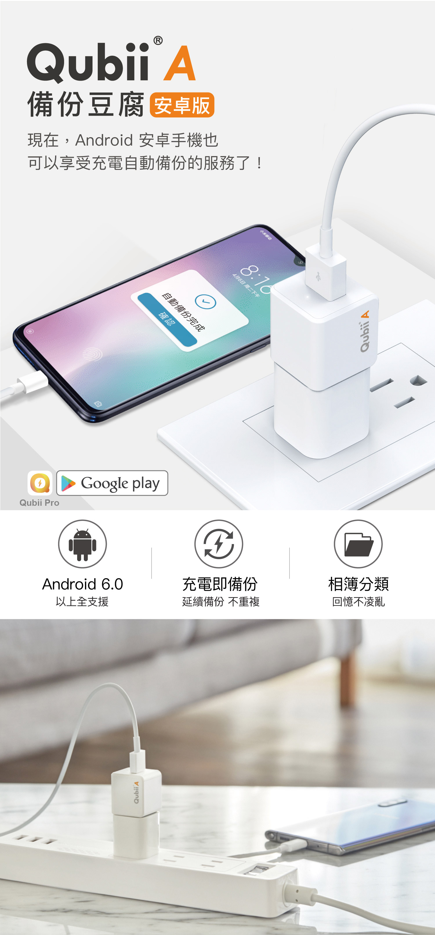 充電器只要多加一個Qubii A備份豆腐,每次充電時就自動幫你備份手機照片、影片、聯絡人...等資料,再也不必再擔心忘記備份或是手機突然遺失、壞掉,所有珍貴照片一夕之間不見!