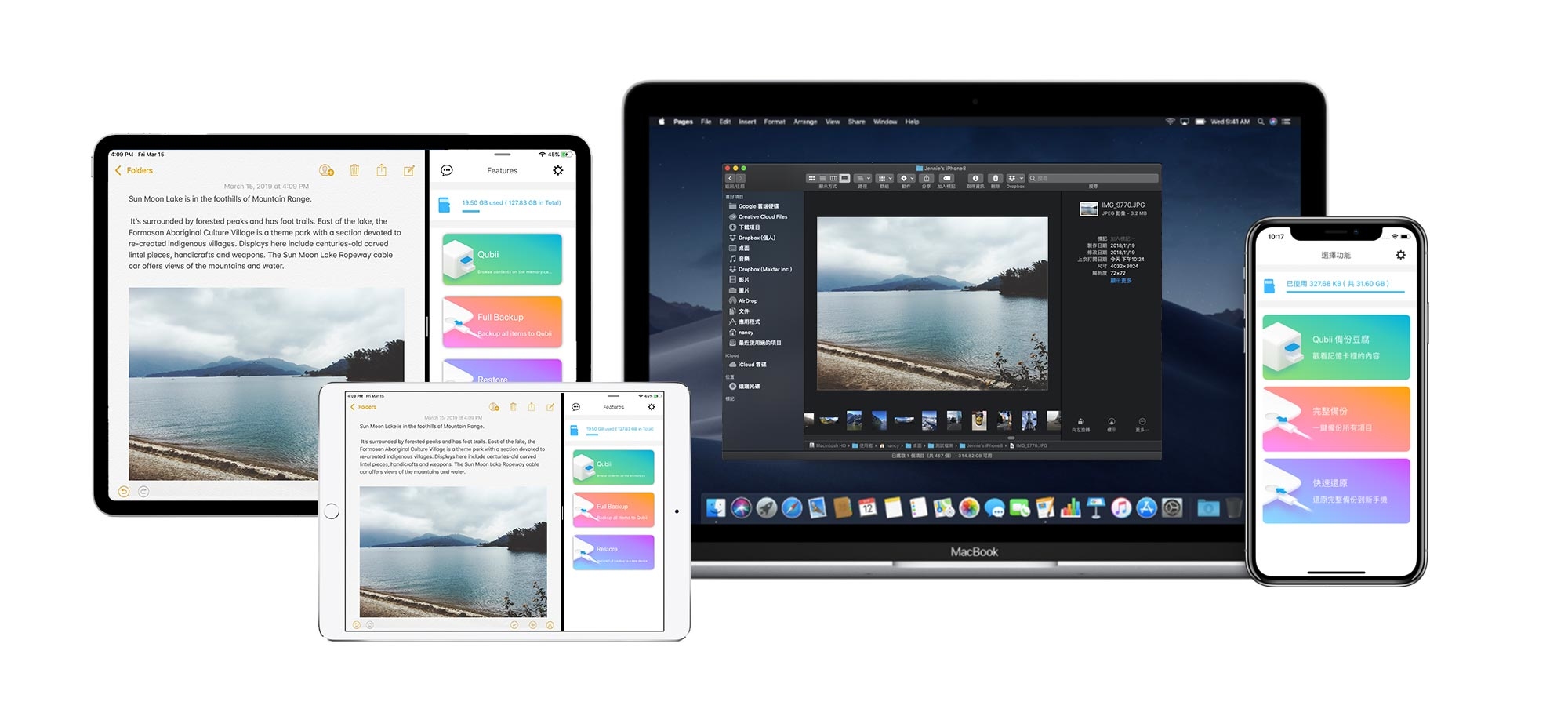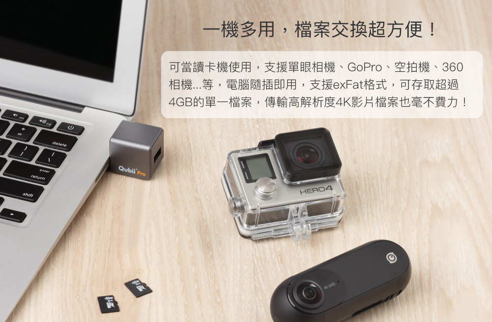 Apple於2018年10月推出新USB-C規格的iPad Pro,Qubii Pro是全球第一可同時支援USB-C&Lightning接口的雙向儲存裝置,並可支援iPad分割顯示功能*Split View,多工模式讓你可直接拖拉使用照片!可以直接把檔案存到Qubii Pro空間裡,存滿會自動通知換卡,記憶卡無容量限制,輕鬆打造自動備份的個人儲存空間,不怕資料存在雲端被駭客盜取!