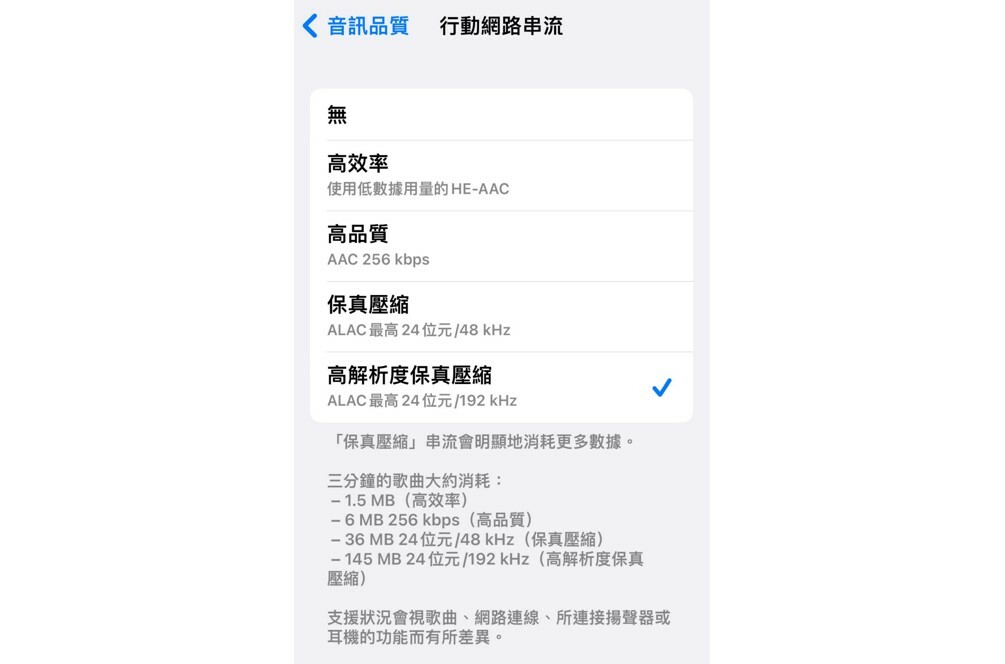 ▲ 要聆聽 Apple Music 的保真壓縮最高解析音質,可從選單內進行設置,當然高音質也代表更高的資料傳輸量,若是非網路流量吃到飽的用家,可斟酌啟用。