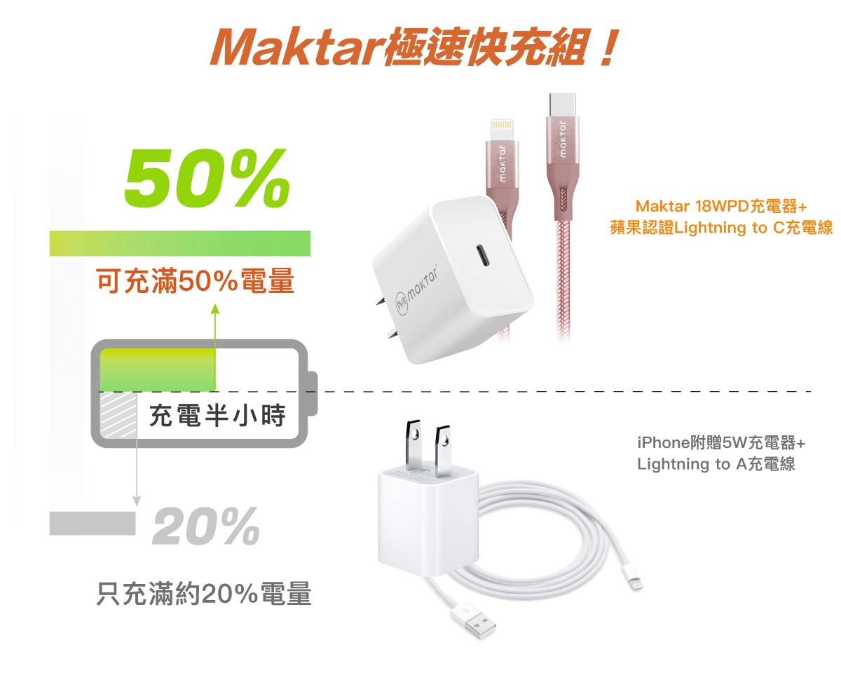 Maktar 18W USB-C 極速快充組支援市面多款機種,可為iPhone系列、Samsung系列、小米等手機、Switch及行動電源提供高速充電,兼容性最高,蘋果認證充電線品質保證,一年原廠保固使用更安心。