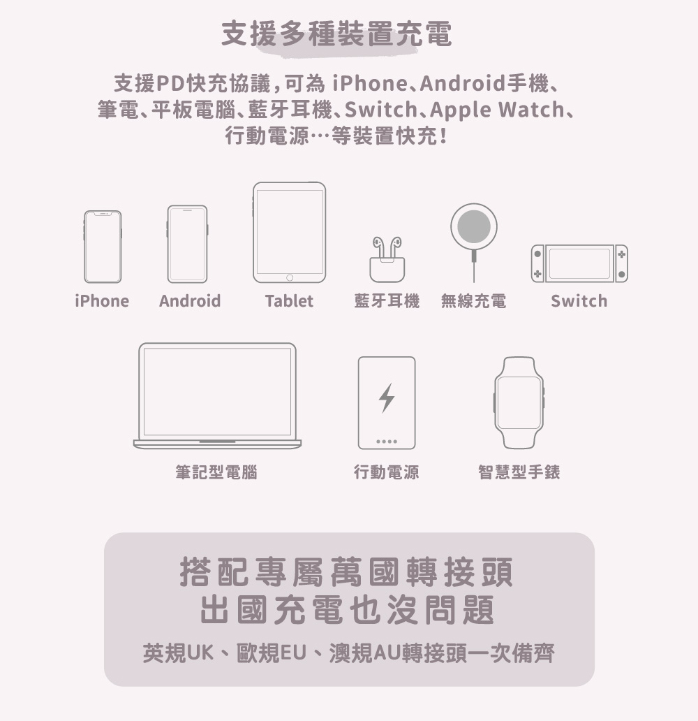 ⭕️ 支援iPhone、安卓手機、筆電、平板、Switch、AirPods、行動電源等裝置快速充電