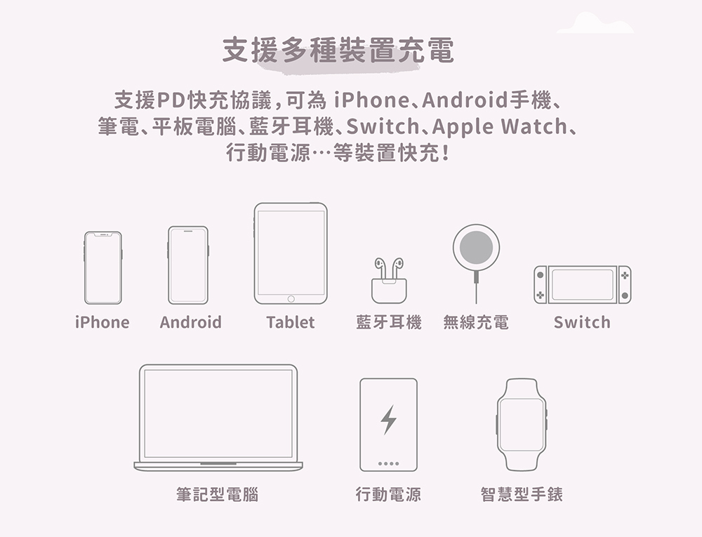 ✅ 支援蘋果/安卓手機、筆電、平板、Switch、AirPods、行動電源等裝置快速充電
